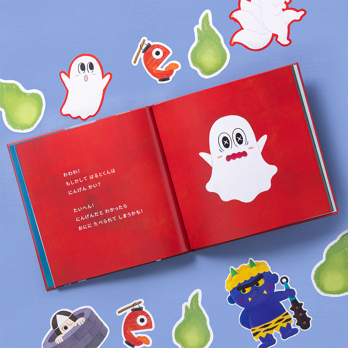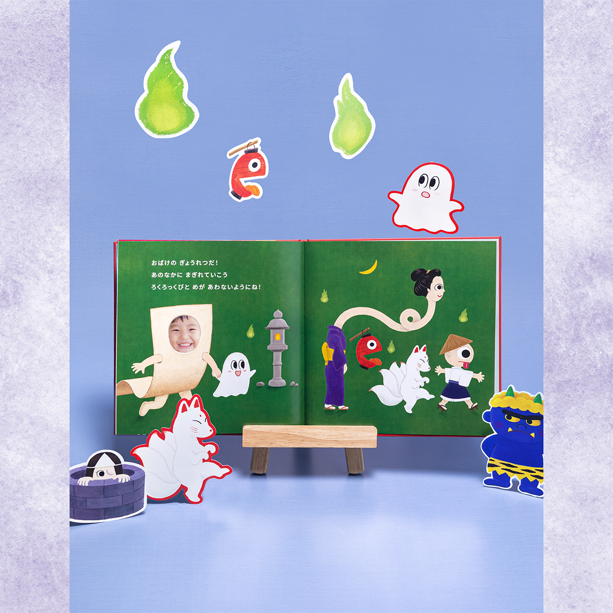 「おばけのくに」に迷い込んでしまった主人公。からかさおばけ、ぬりかべ、かっぱ……鬼に見つからないよう、いろいろなおばけに変装します。主人公は無事に「にんげんのくに」にもどれるかな?